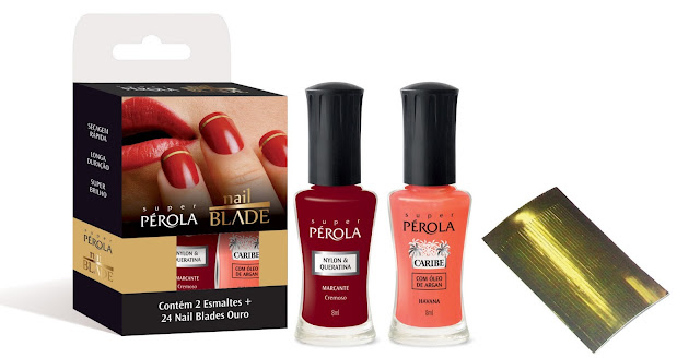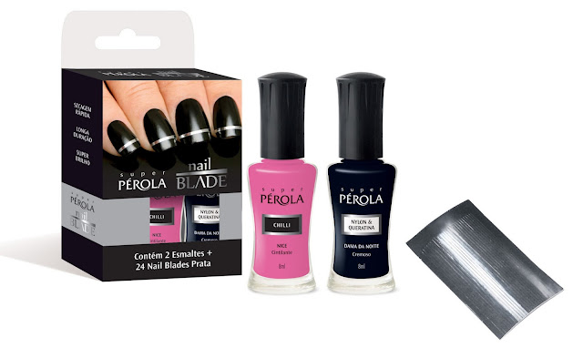 "Baseado em uma técnica de nail art criada recentemente no Japão, a Super Pérola lança os Nail Blades, kits com esmaltes e fitas metálicas autocolantes, que garantem glamour e sofisticação nas pontas dos dedos.Com este novo acessório, é possível deixar as unhas com um visual fino e sofisticado, de forma rápida e prática, ideal para a correria do dia a dia. É só usar a criatividade."